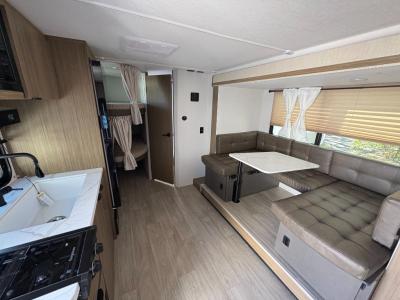 Bring your whole crew along for trips in this roomy travel trailer that can sleep eight people each night. Once you've set up the 14' power awning with LED lights, make lunch on the outside kitchen. Explore some trails or take your fishing poles down to the river, then head back to the trailer to clean up in the full bath. The kids may want to rest on the double-size bunks, while the adults play a game around the U-shaped dinette. This model also includes a sofa plus a Murphy bed that lowers over the sofa when you're ready for bed. Don't let this travel trailer slip away!