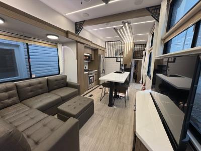This thoughtfully designed 42ZEN model provides a blend of comfort and functionality. It features two lofts for added sleeping and living space, one includes a 62" x 74" Versa queen mattress and a dresser for storing clothes and essentials, while the second loft offers another Versa queen bed, plus a table with recessed footing, perfect for getting work or study done on the road. There is also a cabinet and shelf to keep everything organized. On the main floor, you'll find a large rear full bathroom, complete with a walk-in shower, linen closet, and washer/dryer prep, providing all the comforts of home. The main living area centers around a large sectional sofa with room for the whole crew, facing a fireplace and Televator TV, making it the perfect space to relax after a long day. The kitchen island also adds valuable prep space and also serves as a gathering spot with room for stools. Up front, the master bedroom features a king-size bed with Versa Tilt, a dresser, and its own private bathroom, offering convenience and privacy whenever you need it.